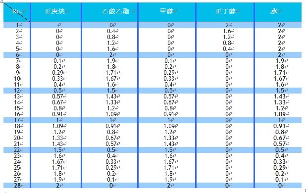 通常的做法是,首先在上表中,每隔4个选择一个溶剂组合体系进行试验,从中选出两组最合适的溶剂组合体系。然后在这两组溶剂组合之间再继续进行实验。或者,根据HPLC检测结果,在表中向上或向下移动,每次只测试一种溶剂体系的方法。采用后一种方法时,首先,按上表中间的配比配制溶剂体系,根据HPLC的结果,计算分配系数。如果目标化合物主要在下相,水层中(也就是D值太小),那么在表中上行,试试极性更强的溶剂体系。如果目标组分主要出现在上相,有机层中(也就是D值太大),那么在表中下行,试试极性较弱的溶剂体系。重复上述过程,直到找到最佳的溶剂体系。